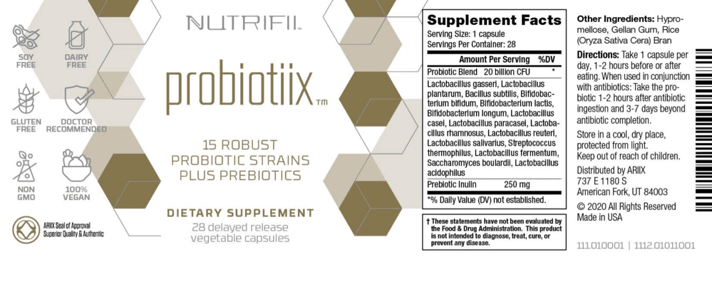 Nutrifii™ Probiotiix™ offers an advanced formulation of 15 different strains of broad-spectrum probiotics, including prebiotics, to support healthy immune and digestive systems, improve nutritional absorption, help manage weight, prevent bloating, improve memory and boost mood.